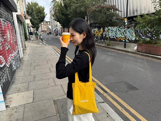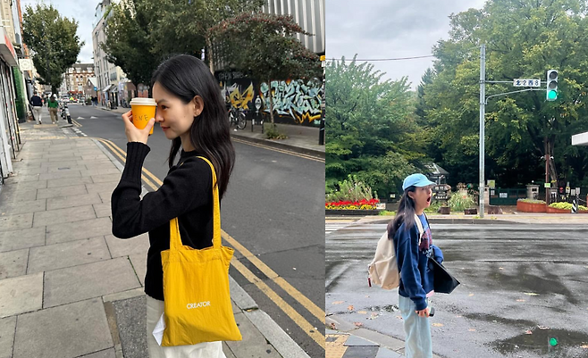 첫 번째 사진에서 김윤혜는 검은색 니트와 흰색 팬츠를 매치하여 심플하면서도 세련된 캐주얼 룩을 연출했다. 여기에 노란색 토트백을 포인트로 활용하며 밝고 경쾌한 느낌을 더했다. 거리의 그래피티와 어우러진 스타일은 스트리트 패션의 자유로움을 잘 보여준다.