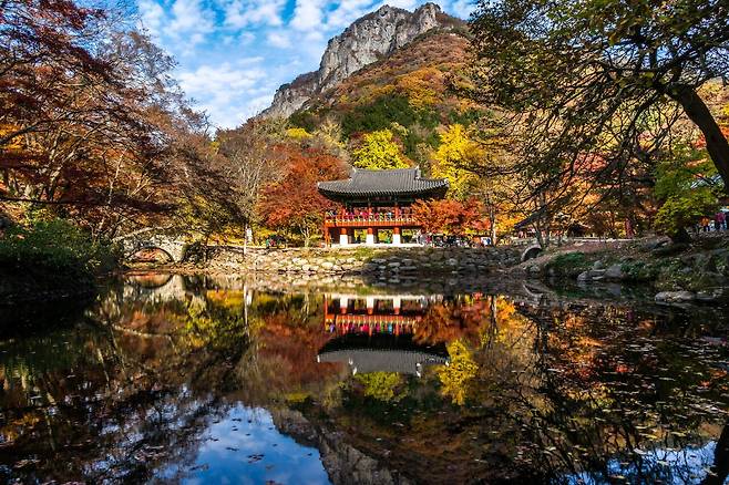 작은 연못 가운데 둥그스름한 돌다리 위로 나 있는 작은 정자와 내장산의 단풍. 내장산 단풍과 어울린 우화정에서만 볼 수 있는 신비로운 곳이라 그 아름다움을 말로 표현해 내기가 어려울 정도입니다.