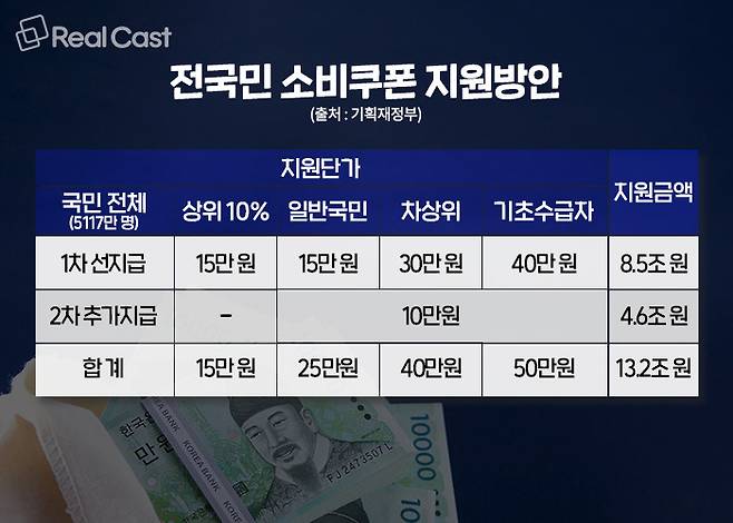 세부적으로는 소득 상위 10% 이상 국민에게 15만 원, 일반국민은 25만 원, 한부모가정 및 차상위계층에 40만 원, 기초수급자에게 50만 원이 지급됩니다. 농어촌 인구감소지역 주민에게는 1인당 2만 원을 추가 지급할 계획입니다.