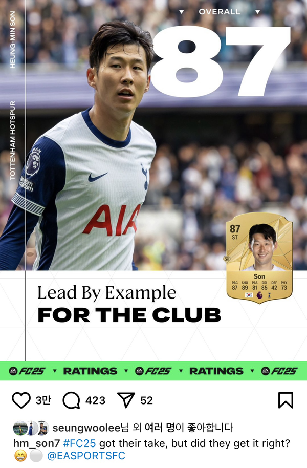 그러던 중, 손흥민이 ‘FC 25’를 향해 재치있는 한 마디를 던졌다. 손흥민은 12일 개인 SNS를 통해 자신의 게임 능력치가 포함된 사진을 게재하며 “FC 25가 평가한 능력치지만, 과연 그들이 제대로 측정했을까?”라며 자신의 능력치에 대해 장난 섞인 농담을 건넸다.
