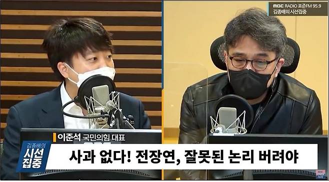 | ▲ MBC <김종배의 시선집중>(2022/03/31)에서 이준석 당시 국민의힘 대표가 전장연 이동권 시위를 주제로 진행자와 대담하고 있다. |
