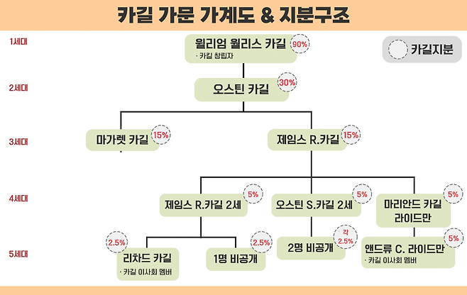 맥밀런 가문의 지분이 상대적으로 많은 이유는 창업주인 윌리엄 월리스 카길(William Wallace Cargill)의 남다른 사위 사랑 때문이다. 윌리엄 창업주는 딸 에드나 카길 맥밀런(Edna Cargill MacMillan), 아들 오스틴 카길(Austin Cargill), 사위 존 H. 맥밀런(John H. MacMillan) 등에게 동일하게 지분 30% 씩을 상속했다. 이후 가문의 상속 원칙이 그대로 이어져 내려오면서 맥밀런 가문 소유 지분이 정확하게 2배 많은 상태가 된 것이다. 현재 두 가문 소유 지분은 전부 카길 패밀리 신탁(Cargill Family Trust)이 통합 관리하고 있다.