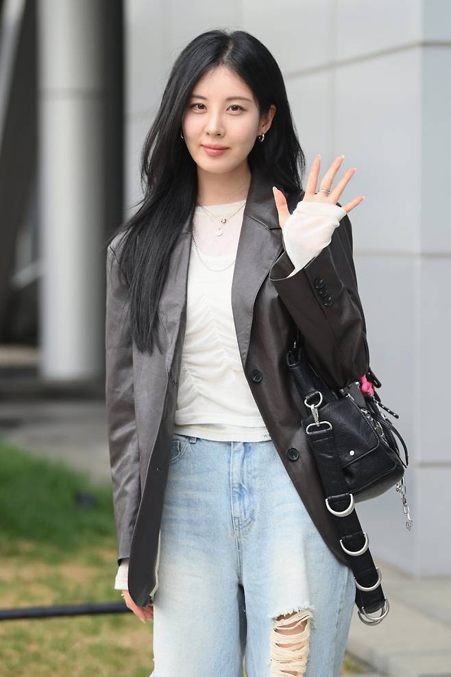 이날 서현은 화이트 티셔츠에 디스트로이드 데님 팬츠를 매치해 내추럴하면서도 시크한 분위기를 연출했다.