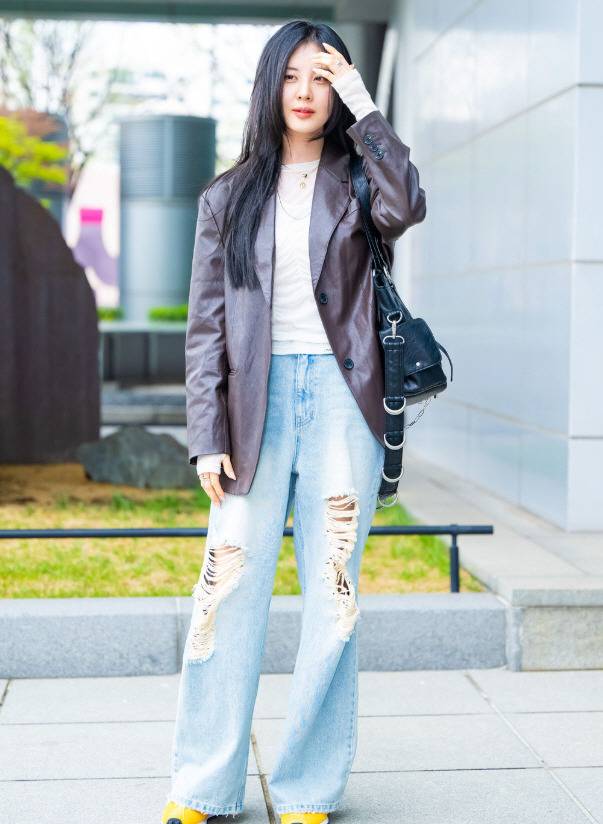 여기에 포인트로 걸친 가죽 자켓이 룩의 완성도를 높였으며, 간단한 조합이지만 트렌디한 감각이 돋보였다.