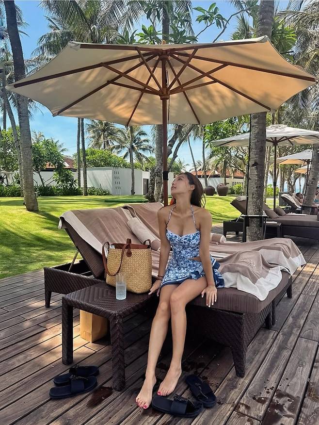 햇살 아래 더 빛나는 그녀의 피부 톤과 화사한 플로럴 패턴은 찰떡 조합을 이루며 여름 휴양지 패션 교본 그 자체였습니다.
