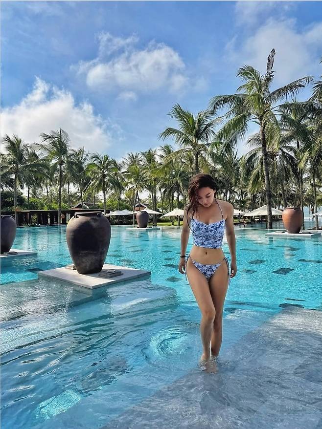 김희정은 블루 플로럴 패턴의 비키니 톱에 몸에 밀착되는 하이웨이스트 디자인으로 늘씬한 허리를 강조한 랩 스커트를 매치해 감각적인 리조트룩을 완성했습니다.