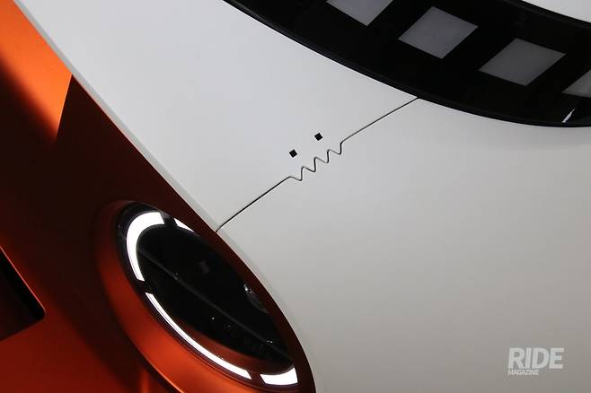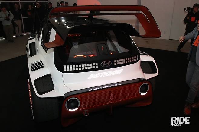 사전에 티저영상을 통해 대략적인 제품의 형태를 먼저 공개했는데, 차체 후방에 거대한 스포일러 같은 것이 언뜻 스쳐지나가는 모습이 보였다. 캐스퍼 일렉트릭 차체보다 더 넓어보이는 스포일러라니, 극적인 느낌을 살리기 위한 과장이겠거니 생각하며 행사장에 도착했는데, 불이 켜지자마자 웃음이 터져 나왔다. 영상에서 본 큼지막한 리어 윙 스포일러를 달고 있는 모습이 마치 아빠 옷을 빼입은 듯한 어린아이를 보는 것 같았기 때문. 여기에 전면부 역시 거대한 스포일러를 더했고, 차체 바깥쪽으로 상당히 돌출된 오버펜더와 거대한 타이어 등은 마치 덩치가 커 보이려고 한껏 어깨를 부풀린 어린아이의 모습 같다.