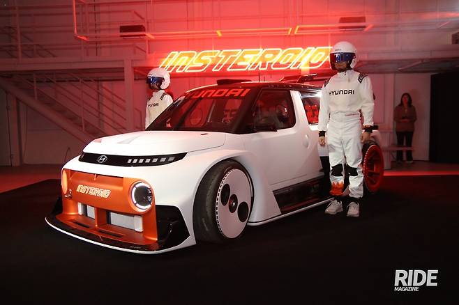 실내는 레이스카처럼 시트와 대시보드 등 기존 인테리어 요소 대부분을 제거해 날것 그대로의 모습을 보여준다. 여기에 롤 케이지와 버킷 시트, 여러개의 작은 스크린으로 이어진 계기판 정도가 구성 요소의 전부. 센터 콘솔 쪽에는 거대한 핸드 브레이크가 배치되어 이 모델이 드리프트에 특화된 모델임을 보여분다. 전기차의 약점은 청각적 요소, 사운드의 부재인데, 이미 아이오닉 5N에서 보여준 가상 사운드가 업그레이드되어 인스터로이드에 적용됐다. 승하차는 물론이고 대기 중, 드리프트 등 상황에 맞춰 개발된 ‘인스터로이드 유니크 사운드’가 제공되어 차량과 운전자가 감성적으로 소통한다는 새로운 개념을 선보였다. 그리고 전기차인 만큼 지속 가능성 또한 고려해야 하는데, 이를 위해 3D 니트 원단을 재활용한 실을 인테리어에 사용했고, 격자 무늬의 경량 레티스 구조로 차량 전반의 무게를 줄이면서도 친환경까지 고려했다고.