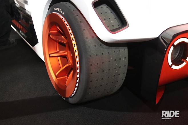 전면부는 캐스퍼 일렉트릭 특유의 디자인을 이어받아 개성 넘치는 표정을 완성했다. 휠은 무려 21인치로, 여기에 340mm에 달하는 거대한 타이어를 장착해놓아 귀여움 속에 파워풀함을 함께 보여주는 요소다. 타이어는 피렐리 최상위 모델인 피제로를 적용했는데, 타이어 패턴에 캐스퍼 일렉트릭의 헤드라이트 디자인을 연상케하는 큐브 모양을 새긴 전용 타이어가 장착됐다. 타이어 상단에는 가변형 에어 플랩이 적용되어 필요에 따라 여닫히도록 했고, 뒤 펜더 안쪽으로는 라디에이터를 달아 고성능을 내는 배터리의 냉각 효율을 높였다.