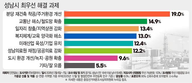 [6·3 지방선거 여론조사-성남시] 최우선 해결 과제 “분당 재건축” 1위…'교통·일자리·복지·공공의료' 고른 요구