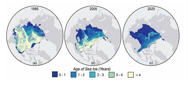 위 그림에서 알 수 있듯 다년생 해빙이 많았던 1985년과 달리 2005년, 그리고 지난해는 해빙 분포가 대부분 단년생 해빙으로 바뀌었습니다. 얇은 해빙은 그만큼 외부 환경에 취약하기 때문에 깨지거나 금방 사라지기 쉽습니다.
