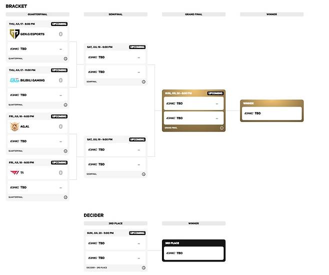 17일부터 본격적인 플레이오프 토너먼트가 진행되며, 젠지와 작년 챔피언인 T1은 여기서부터 출발한다. 이제부터는 결승전을 제외한 모든 경기는 BO3, 결승전만 BO5로 치러진다. EWC LoL은 한국 시각으로 16일 오후 6시부터 시작되며, 결승전이 열리는 20일만 오후 5시부터 3, 4위전이 펼쳐지고 종료된 후 결승전이 진행될 예정이다.