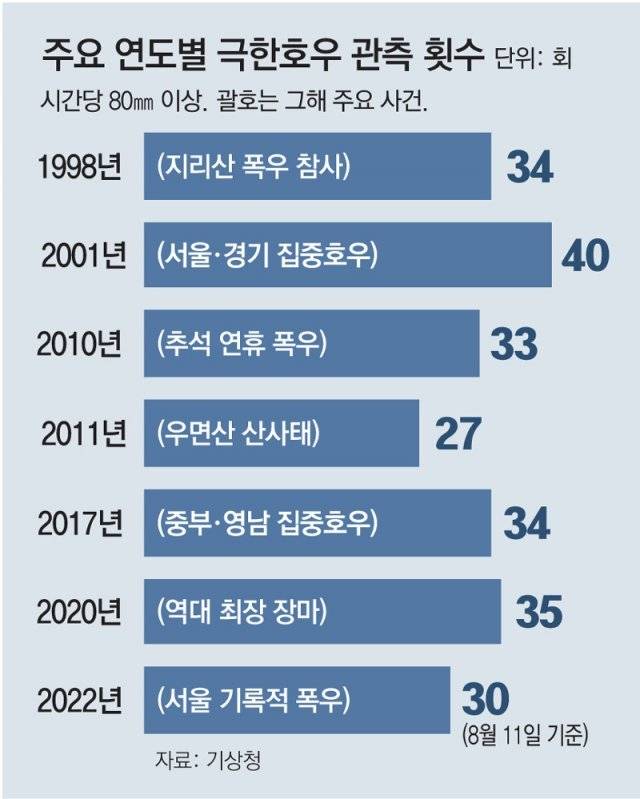 시간당 80mm 이상의 극한호우는 2019년 30회, 2020년 35회, 2021년 21회 관측됐다. 극한호우가 결코 올해에만 국한된 것이 아니라는 뜻이다. 호우로 불어난 계곡물에 324명이 사망하거나 실종됐던 ‘지리산 폭우 참사’가 발생한 1998년에 극한호우 횟수는 34회였다. 특정 지역에 갑작스레 쏟아지는 폭우를 뜻하는 ‘게릴라성 호우’라는 말도 이때 처음 나왔다. 집중호우로 서울·경기 지역에서만 66명이 사망하거나 실종된 2001년에도 극한호우가 40회 나타났다. 이 해에도 7월 서울 종로구 송월동에 시간당 99.5mm, 서초구 서초동에 91.5mm의 비가 내리면서 고속터미널역이 침수되기도 했다.
