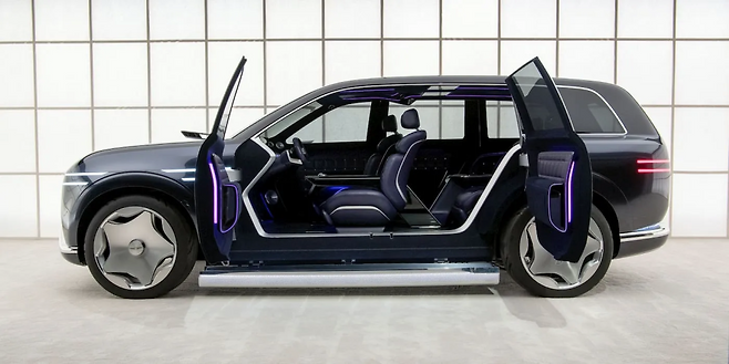 특히 도어 핸들이 차체와 완전히 일체화된 플러시 타입으로 적용되면서 공기저항을 줄이고, 전기차다운 미래적인 인상을 동시에 만들어냅니다. 한편, A필러부터 C필러까지 이어지는 매끄러운 루프라인은 단순히 크기만 키운 SUV가 아니라 '전기 플래그십'이라는 정체성을 분명히 보여줍니다.