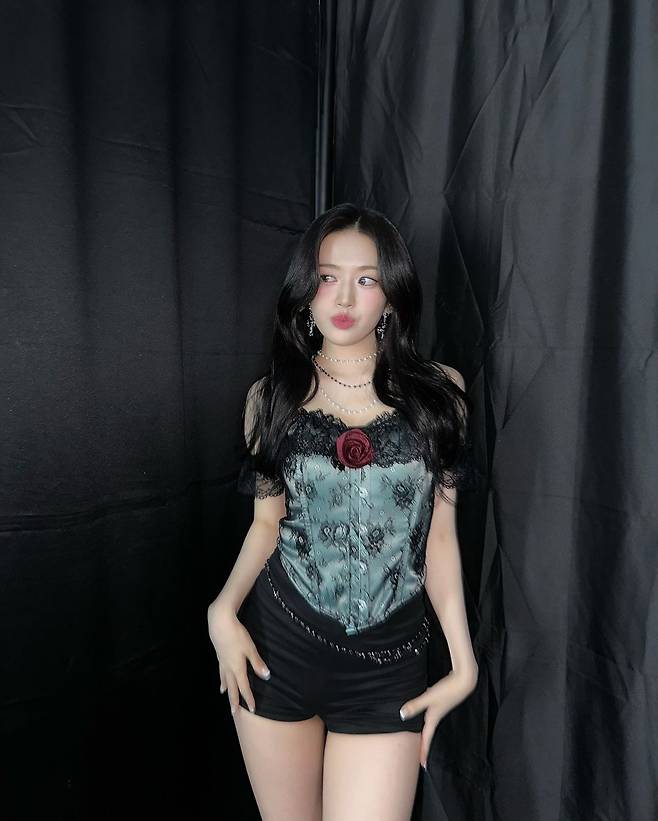 사진 속 안유진은 하늘색의 벨라인 탑 드레스를 입고 여신 미모를 자랑했다. 또 다른 사진에서는 브이넥의 패턴이 있는 미니 원피스를 입었고, 블랙 레이스와 플라워 장식의 포인트인 티와 블랙 팬츠를 입고 날씬한 몸매를 자랑했다.