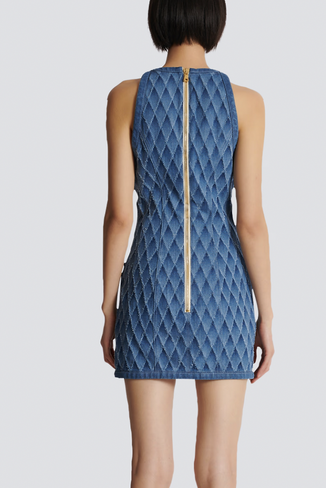 Short dress in laser-cut denim