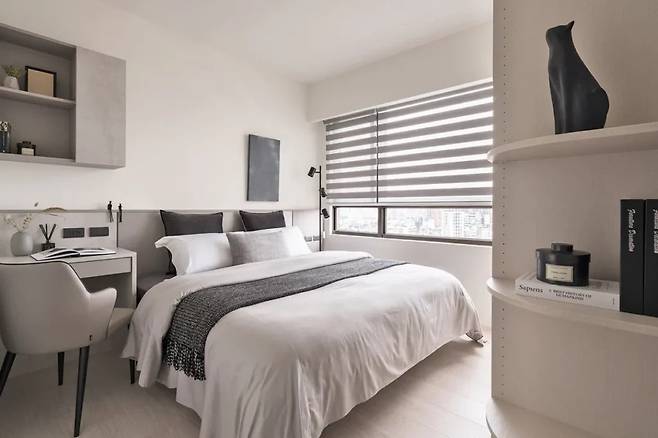 침실은 자연 채광과 은은한 시스템 조명이 어우러져 있으며, 부드러운 감촉의 미색 직물 텍스처 패널을 사용해 시각적 안정감을 제공한다. 벽면 수납은 눈에 띄지 않게 배치되어 수면에 방해받지 않도록 했다.