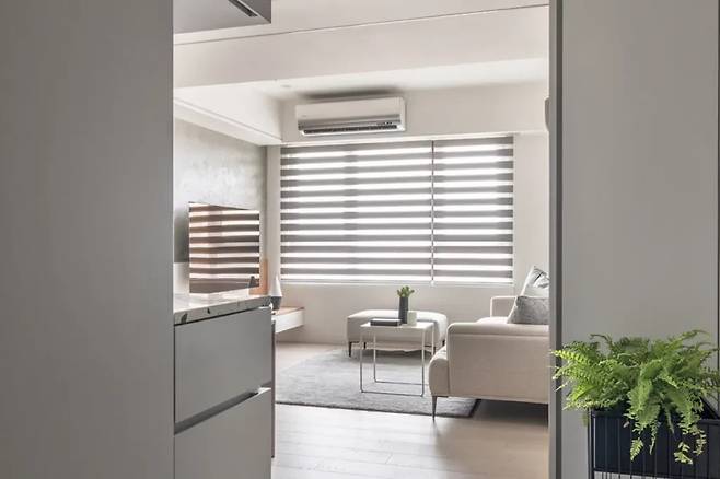 바닥의 색상이 점차 옅어져 부드러운 경계를 형성하며, 실내로 들어올 때 자연스러운 시선의 흐름을 유도한다. 벽과 같은 흰색으로 마감한 슬림한 수납장은 시각적으로 공간을 넓어 보이게 한다. 식당 벽면에는 회색 락카로 마감된 플로팅 수납장을 설치해 공간의 확장성을 더했다.