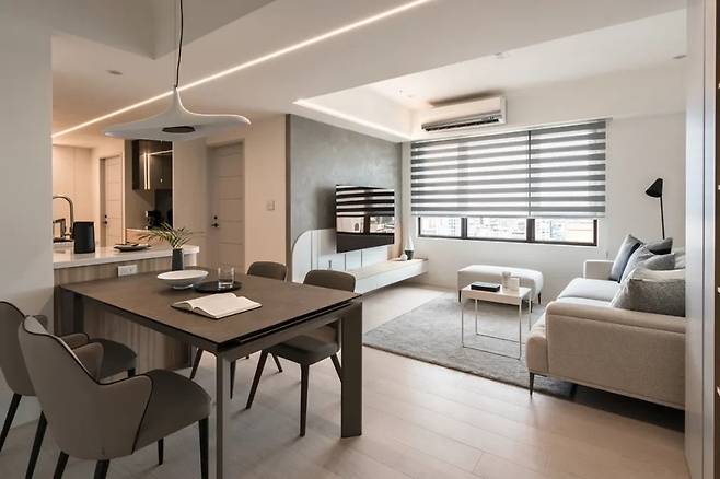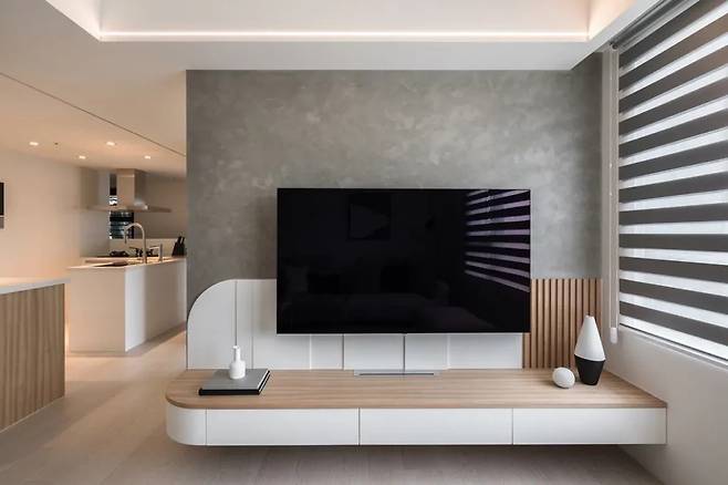 입구에 들어서자마자 눈길을 끄는 것은 TV가 자리한 메인 벽이다. 무인양품 스타일을 접목한 화이트 우드와 나무 격자 패턴이 따뜻한 느낌을 주며, 격자의 불규칙한 간격은 빛을 받아 드라마틱한 그림자를 만든다. 상단은 라운드 형태로 마감되어, 공간에 부드러운 긴장감을 더한다.