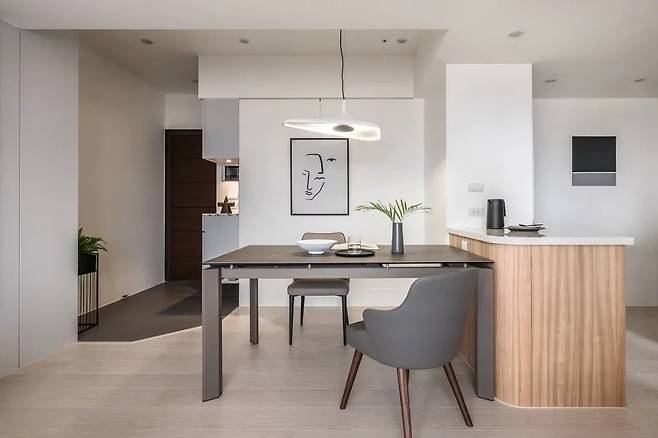 바닥의 색상이 점차 옅어져 부드러운 경계를 형성하며, 실내로 들어올 때 자연스러운 시선의 흐름을 유도한다. 벽과 같은 흰색으로 마감한 슬림한 수납장은 시각적으로 공간을 넓어 보이게 한다. 식당 벽면에는 회색 락카로 마감된 플로팅 수납장을 설치해 공간의 확장성을 더했다.