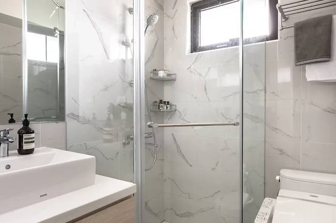 게스트 욕실은 오각형 샤워부스를 설치해 공간을 명확히 구분했다. 전체 타일은 카라라 대리석 스타일의 자기질 타일로 마감해 일관된 모습을 유지했다.
