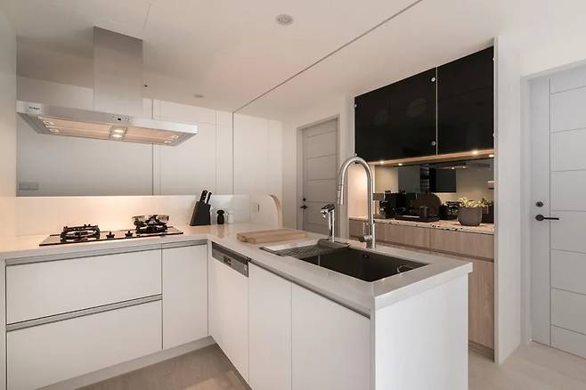 주방 동선은 길게 이어진 일자형으로, 조리대와 세척대가 양쪽에 배치되어 있다. 세면대는 양쪽에서 접근 가능해 다양한 동선에 유연하게 대응하며, 조리와 세척, 수납이 원활하게 이루어진다.