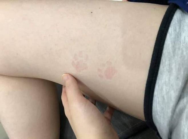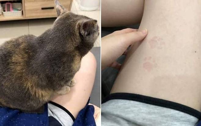 사연은 이렇습니다. SNS상에는 고양이 발바닥 자국이 선명하게 찍혀 있는 집사의 허벅지 모습이 담긴 사진이 올라온 것.