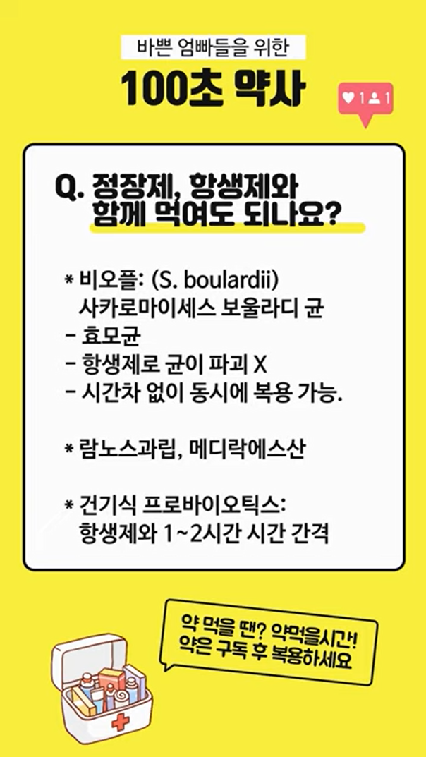 이 정장제가 항생제로 인한 설사증상을 완화해주기 때문에 함께 처방되는 경우가 많아요.