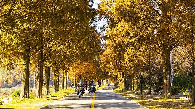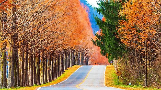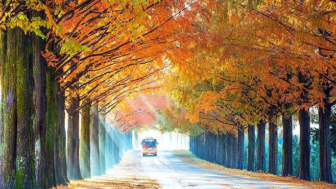 길 양옆으로 늘어선 메타세쿼이아 나무들은 가을이 오면 붉고 노란빛으로 갈아입으며 마법 같은 풍경을 완성한다.