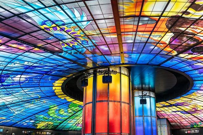 세계에서 가장 아름답다는 미려도역, 그 중심엔 형형색색의 스테인드글라스 천장 ‘돔 오브 라이트’가 있습니다. 규모도 아름다움도 예술관 못지않은 이 공간, 가오슝 여행의 감성 포인트!