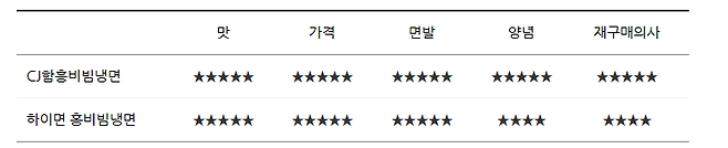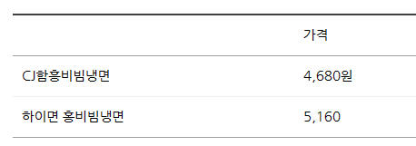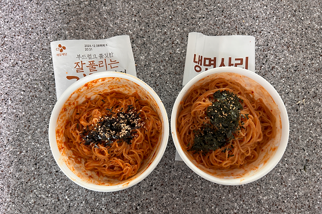 비주얼로만 봤을때는 역시 CJ 비빔냉면이 양념양이 더 많아서 더 빨갛고 맛있어 보이네요!