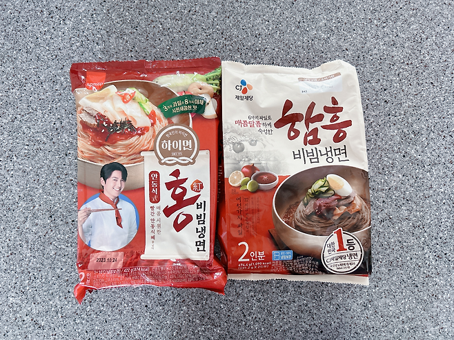 CJ 함흥비빔냉면은 워낙 오랫동안 사랑받아 온 제품이고, 이미 먹어본 적이 있어서 선택! 하이면 홍 비빔냉면은 요즘 대세 류수영배우가 광고하는 제품이라 선택했어요