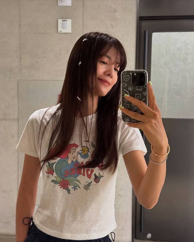 헤어스타일도 눈여겨볼 만하다. 앞머리와 함께 내린 롱 헤어에는 작은 플라워 장식이 촘촘히 더해져 귀여운 포인트를 더했다. 내추럴한 광택과 깔끔한 매무새가 전반적인 룩의 완성도를 높인다. 손톱에는 라이트 그린 컬러의 네일로 상큼한 여름 감성을 더했고, 골드 브레이슬릿과 실버 볼체인 팔찌가 심플한 무드에 은은한 포인트 역할을 한다.