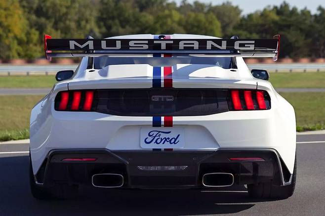머스탱 GTD 스피릿 오브 아메리카는 퍼포먼스 화이트 컬러를 기본으로, 레이스 레드와 라이팅 블루의 레이싱 스트라이프가 차량 전체를 감싸며 역동성을 강조한다.