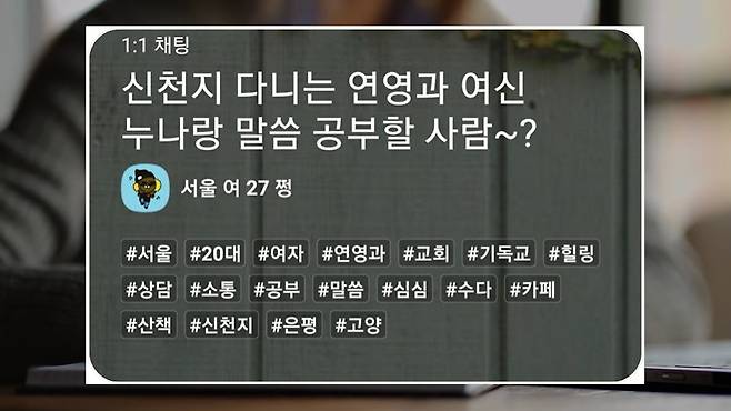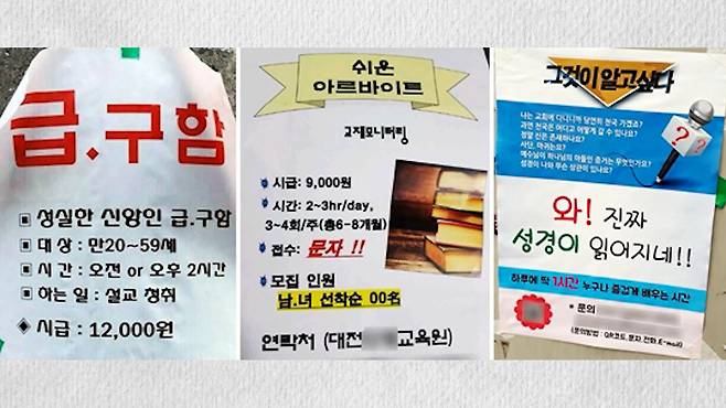 "알바 자리 같은거 만들어 놓고 월급 준다고 하면서 데려오면 성경 필사 같은 거, 일일 알바 같은 거 부탁해서 성경 공부방으로 넣는 거죠."