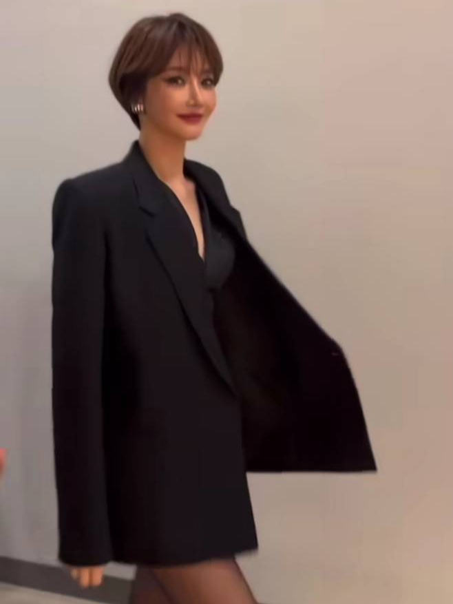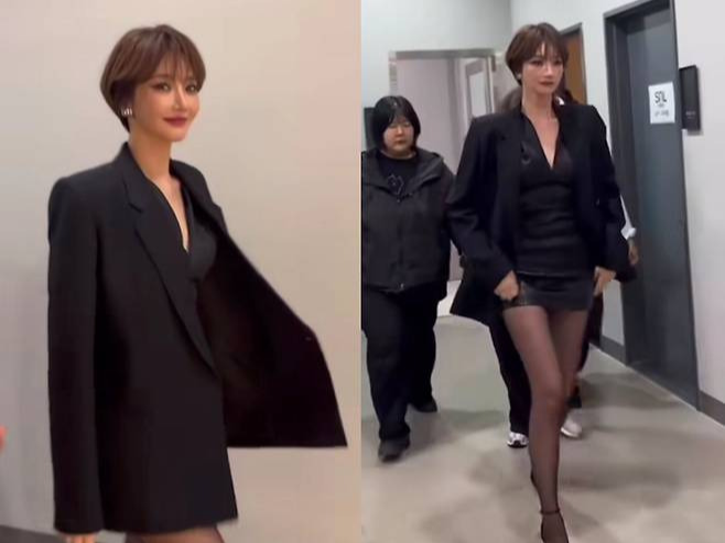 여기에 고준희는 블랙 더블브레스트 재킷을 걸쳐 시크하고 스타일리시한 하의실종룩을 완성했습니다.