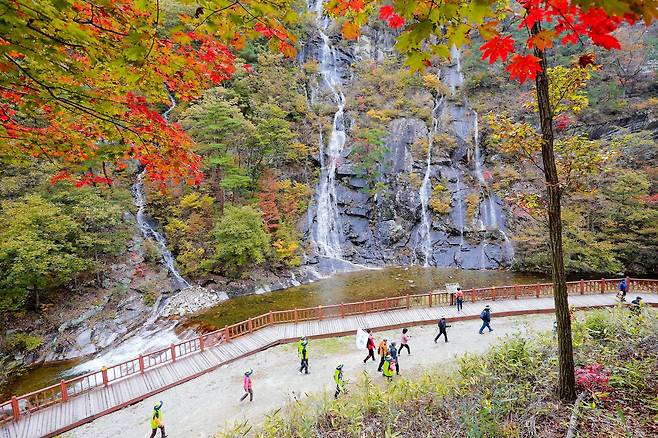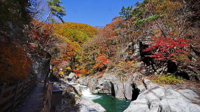 용소를 지나면 길이 두 갈래로 나뉩니다. 하나는 조금 더 험하고, 때로는 아찔한 산길이고, 다른 하나는 완만하고 걷기 좋은 산책로입니다. 중간중간 놓인 징검다리를 건너며 양쪽 길을 오가다 보면 어느새 마음도 가벼워집니다. 계곡을 따라 흐르는 물소리와 함께 걷는 시간, 그 자체가 여행의 쉼표가 되어줍니다.