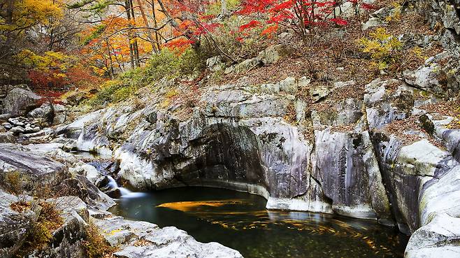 걷다 보면 신비로운 이야기를 품은 두 곳을 만납니다. 바로 아랫용소와 윗용소입니다. 전설에 따르면 이곳에는 아빠 용, 엄마 용, 어린 용이 살았다고 전해집니다. 그래서인지 물빛이 유난히 푸르고 깊습니다. 윗용소 바위에는 오래전 신선이 바둑을 두었다는 바둑판 흔적이 남아 있습니다. 넓은 바위 위에 앉아 바둑을 두며 술 한 잔을 기울였을 신선을 떠올리면, 시간조차 느리게 흐르는 듯한 평온함이 밀려옵니다.