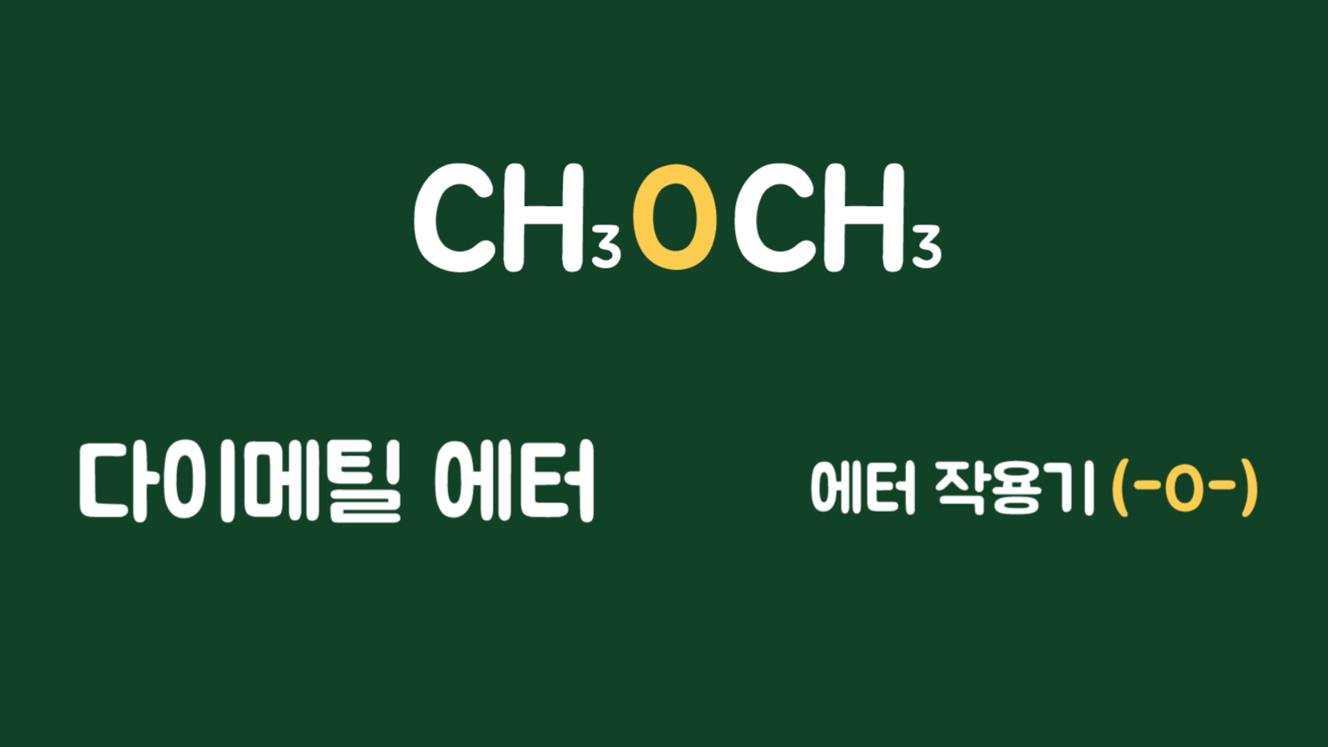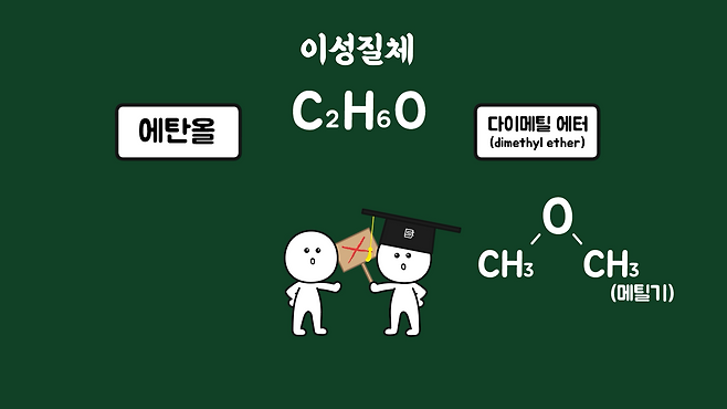 이와 같은 물질을 이성질체라고 하는데, 이성질체 중 하나는 지금까지 봤던 에탄올이고, 나머지 하나는 다이메틸 에터(dimethyl ether)로 산소 양옆에 메틸기(CH₃)가 결합되어 있는 구조입니다.