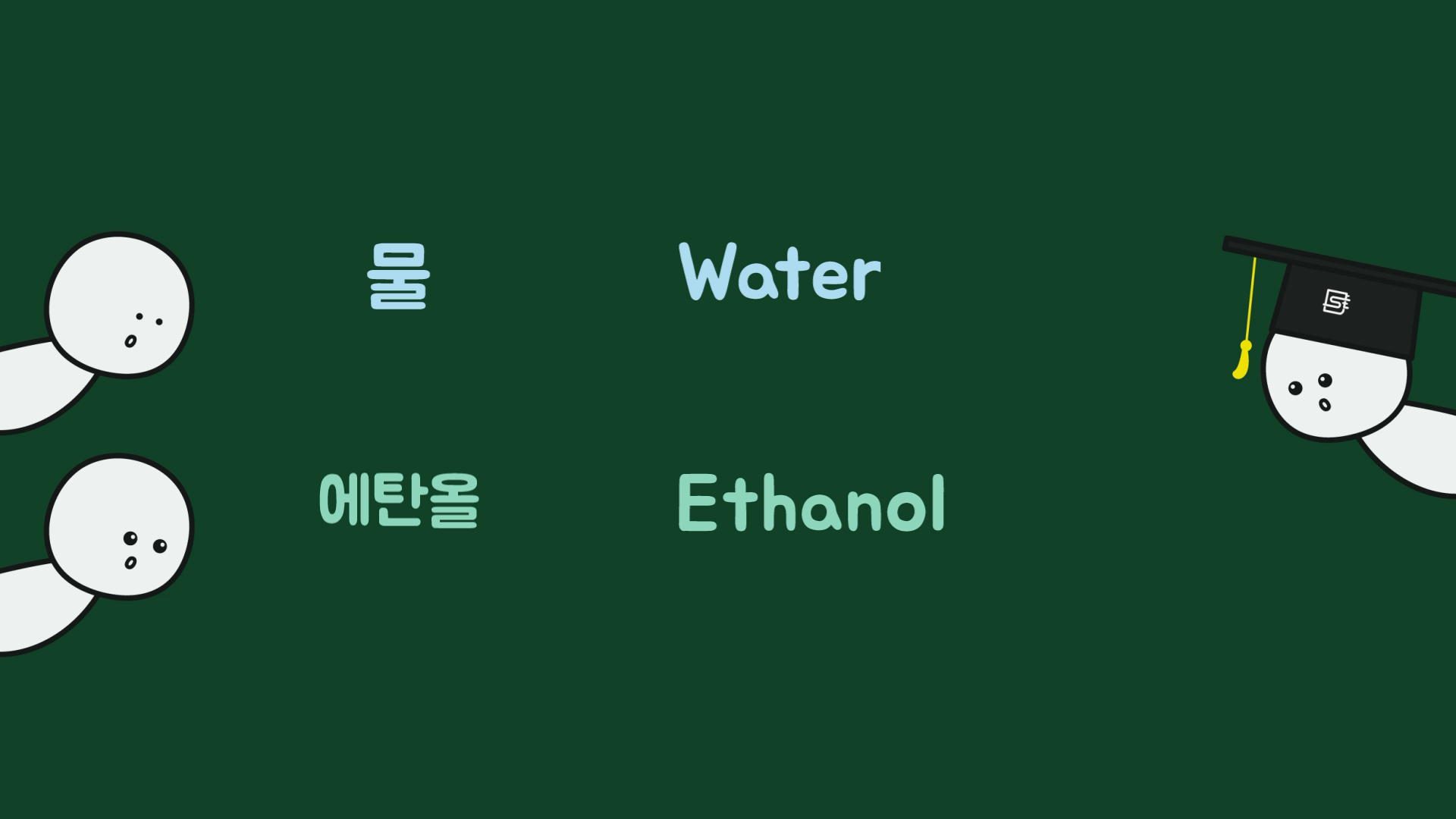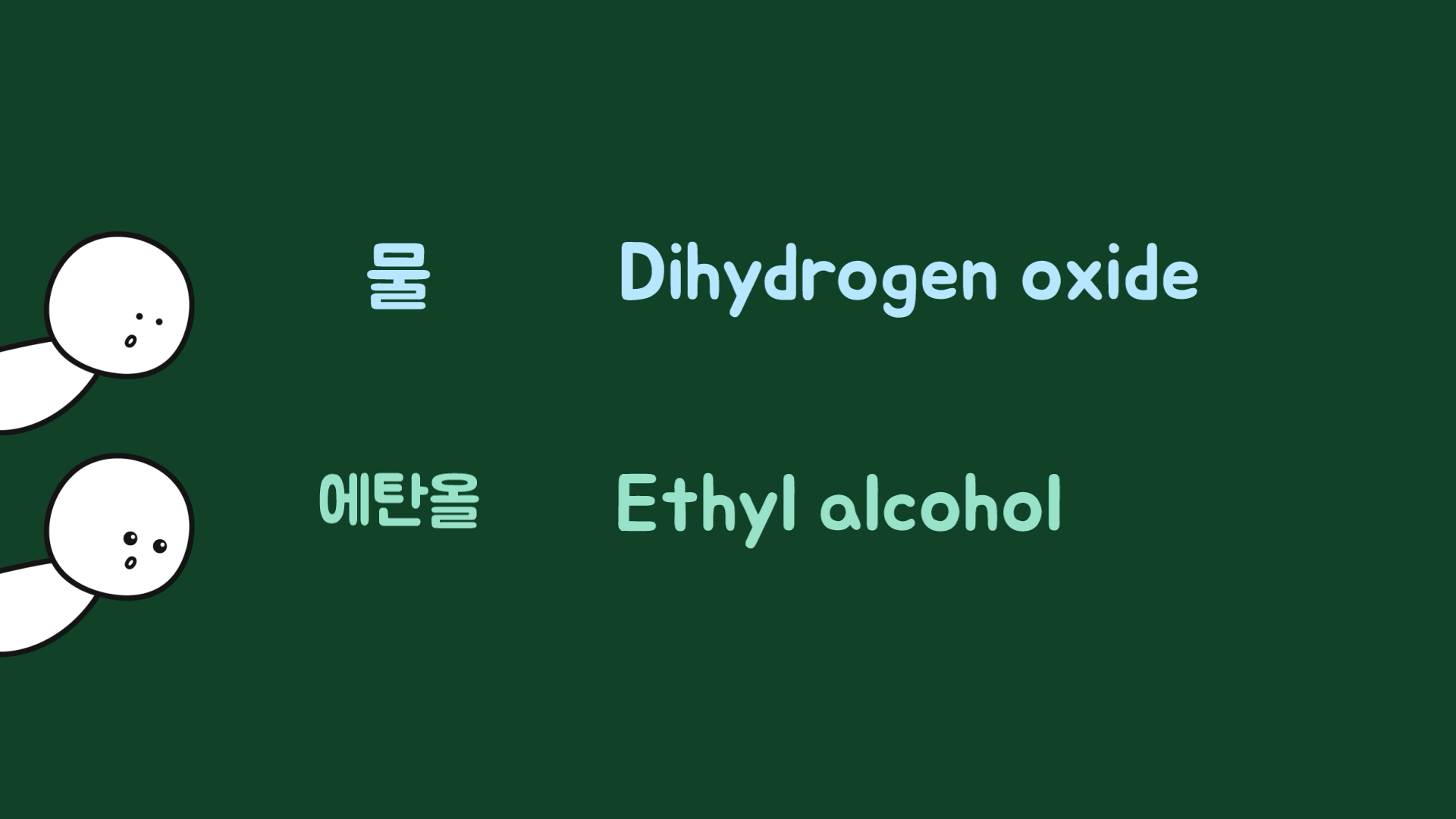 앞서 소개한 물과 에탄올을 IUPAC 명명법의 규칙대로 쓴다면 아래와 같습니다. 하지만 너무 일반적인 물질이라 공식명칭은 Water, Ethanol과 같이 쓰고 있습니다.