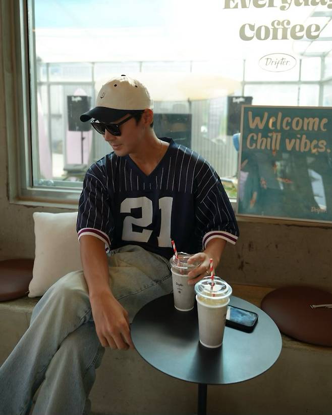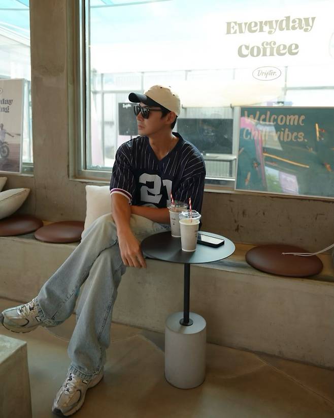 전진은 캐주얼한 스포츠 저지와 데님으로 편안한 스타일을 연출하며 훈훈한 비주얼을 자랑했다.