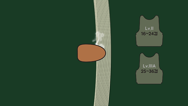 그래서 케블라로 수십 겹을 짜서 옷을 만들면 탄환이 쉽게 뚫지 못하고, 운동에너지를 차차 잃게 됩니다. 또 탄환이 뚫는 과정에서 발생하는 열이 섬유를 녹여 응집 작용이 일어나는 것과 탄환이 납작하게 눌리면서 관통력이 약해지는 것도 한몫합니다.