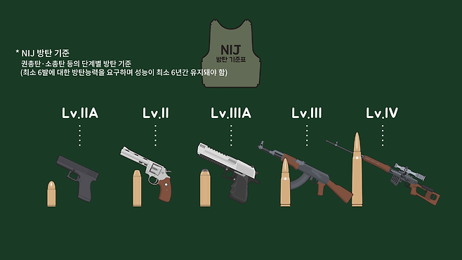 이런 부분들을 응용해서 탄환을 특수하게 만들면 방탄복도 뚫을 수 있는데, 대표적으로 철갑탄이 있습니다. NIJ(미국 국립사법연구소, National Institute of Justice)에서 정한 방탄 기준표를 보면 레벨 3 이상은 돼야 철갑탄을 막을 수 있습니다.