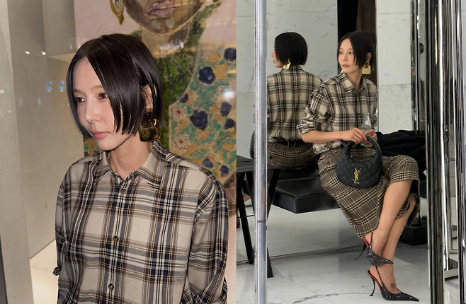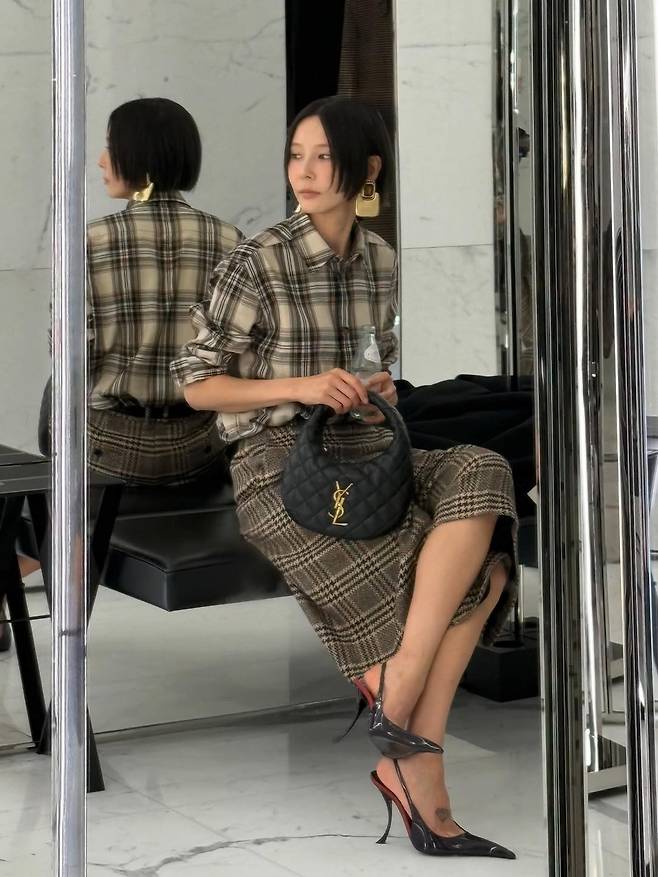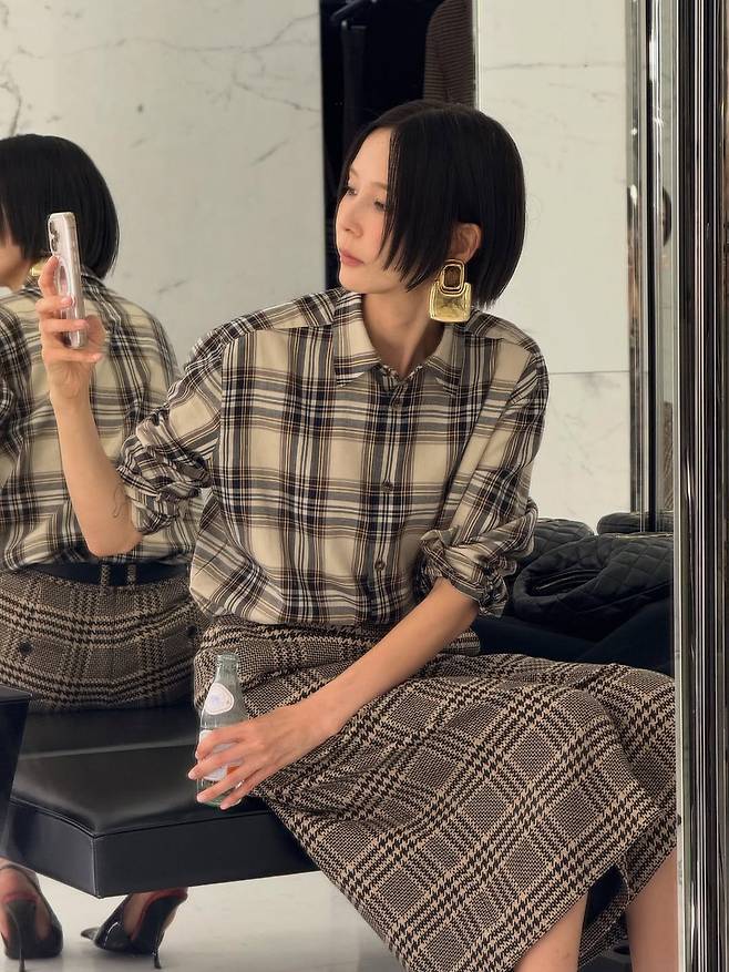 톤이 다른 브라운 계열의 체크 셔츠와 펜슬 스커트를 매치하는 과감함은, 자칫 촌스러워 보일 수 있는 조합을 세련되게 소화하는 그녀의 패션 내공을 보여줍니다.