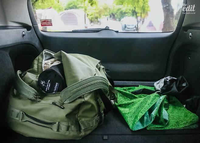 젖은 텐트와 타프는 김장 비닐, 방수 가방, 폴딩 박스 등에 넣어 온다. 파우치에 젖은 텐트를 접는 일은 쉽지 않다. 주룩주룩 내리는 비를 맞으며 텐트를 구겨 넣는 생각만으로도 등골이 오싹해진다. 다행히 나는 비가 멎었을 때 철수했다. 차 트렁크 바닥에 돗자리를 깔고 탈탈 턴 텐트와 타프를 얹은 채 집으로 돌아왔다.