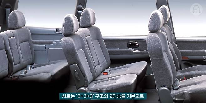 시트는 '3+3+3' 구조의 9인승을 기본으로 '2+3+2' 구조의 7인승, 2열 캡틴 시트의 6인승으로 구성됐으며 1열 등받이에 있는 접이식 테이블을 제외하면 뒷좌석 승객을 위한 공조장치나 수납공간은 조금 부족하긴 했지만, 이 시기 승차정원 늘리기에만 초점을 맞춘 어거지에 가까운 3열이 아닌 제대로 된 3열 시트를 갖췄다는 점도 경쟁력 있는 부분이었습니다. 웬만한 소형 세단의 2열과 비슷한 공간에 심지어 3열까지 중앙 암레스트를 갖춰 성인이 타기에도 부족함이 없었죠.