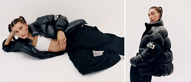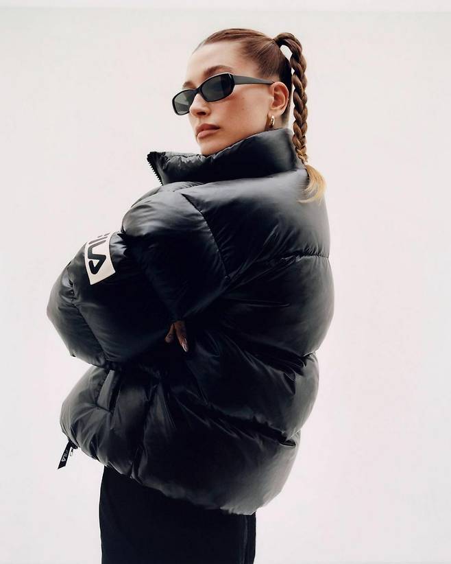 헤일리 비버는 글로시한 질감과 빵빵한 볼륨감이 돋보이는패딩 점퍼를 선택하여 MZ 세대가 열광할 만한 룩의 정점을 찍었네요.