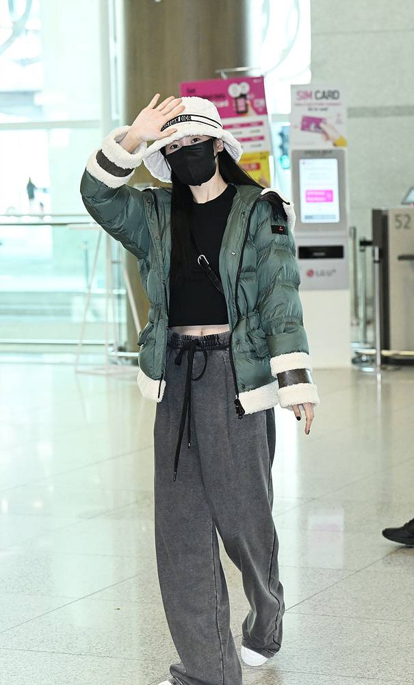 출국길에서는 같은 숏패딩을 화보와는 정반대 느낌으로 연출했는데요.