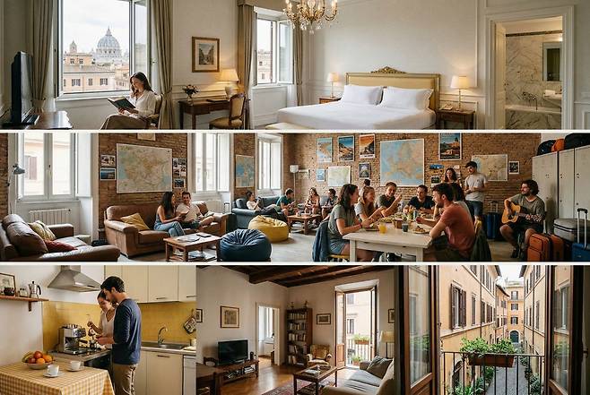 로마 숙소 결정을 앞두고 또다른 고민은 바로 숙박 형태일 것입니다. 결론부터 말씀드리면, 부모님이나 아이와 함께하는 가족 여행이라면 최소 3성급 호텔, 가성비와 정보 공유가 목적이라면 호스텔을, 현지인처럼 살아보는 감성을 원한다면 에어비앤비를 추천합니다.