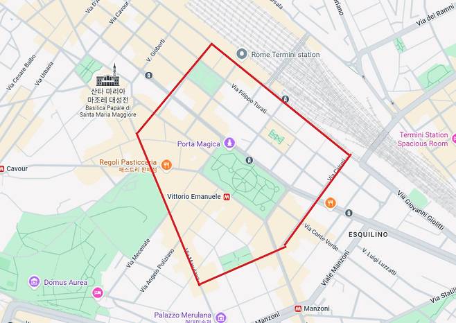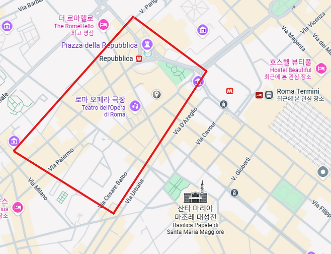 가장 먼저 추천하는 로마 호텔 위치는 테르미니역 기준 북서쪽입니다. 이곳은 로마 국립 박물관과 산타 마리아 마조레 대성당이 가깝고, 상대적으로 거리가 깔끔하며 치안이 안정적입니다.